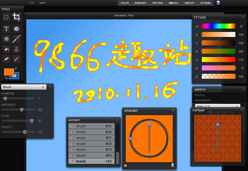 Sketchpad,基于html5的在线图像绘画板.超越flash/java,非常强大。画板支持各种笔刷,向量绘图,步骤记录,颜色透明度调整、提供文字、裁剪、渐变、填充等基本处理功能。 任何人都可以创造美丽的图画。这个网站需要最新HTML5格式的浏览器(Firefox,Safari,Chrome,Opera)才能打开,目前不支持 IE浏览器。 还在等什么?开始涂鸦吧!