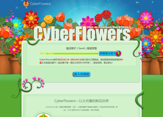 赛博花(cyberflowers)全球首款区块链种花游戏 ,已开始内测。内测版本运行在一个测试以太坊私链上,除交易环节外的其它主要游戏功能都已可以进行试玩。同时开发团队也在以太坊公链上部署了”魔法种子” ERC20 合约,宣布正式版的魔法种子预售正式开始。根据其白皮书披露的信息,预售的魔法种子除了有价格上的优势外,还可更早地开始积累“币龄”,正式版游戏启动运营后将获得更大比例的收入分红。